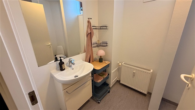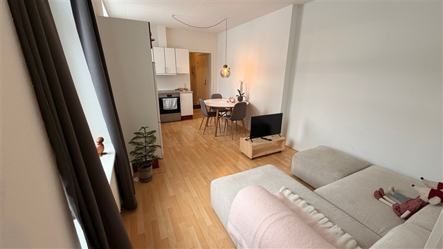 Located in the heart of Kolding city, this rental property comprises an entrance hall, a bathroom, a bedroom, as well as an open-plan living room and kitchen equipped with a stove, extractor fan, and a combined refrigerator-freezer. Residents have access to communal laundry facilities within the building.