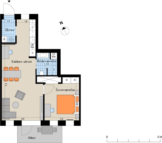 This well-designed apartment features an open-plan kitchen and living area, offering enough space to accommodate a dining table, seating area, and a small workspace. The bathroom is equipped with underfloor heating as well as a washer and dryer. In the bedroom, built-in wardrobes provide ample storage, and there is room to add a second desk. The southwest-facing balcony allows for afternoon and evening sun exposure, contributing to a bright and inviting atmosphere throughout the apartment. The building includes an elevator, and the residence comes with a storage room located in the basement. Bicycle parking is available outside within designated bike areas, while ample parking spots are offered nearby for cars. Several parking spaces are fitted with shared electric car charging stations. Please note that the photos shown are not of this specific unit, so views, room layout, and other details may differ. The images serve solely as examples, and the actual size and arrangement can vary, as indicated in the floor plan.