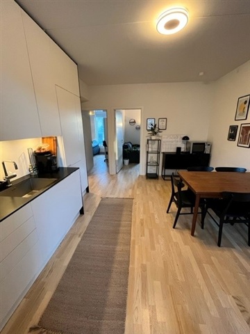 This contemporary apartment features a spacious and bright open-plan kitchen-living area, outfitted with a recently installed kitchen that includes a fridge/freezer, cooktop, extractor hood, built-in oven, and dishwasher. The kitchen-living space comfortably accommodates both a dining table and a seating area. The unit contains two well-lit bedrooms, each equipped with built-in closet space; one of these rooms provides access to a sizable balcony. The bathroom is generously sized and designed in a modern style, fitted with a washing machine, tumble dryer, and shower enclosure. Please note that the photographs shown are from a similar apartment within the same building.The building offers elevator access in the stairwell, and the basement provides facilities for bicycle storage as well as extra storage space. Situated in the sought-after neighborhood of Ceresbyen, the location combines residential living with the nearby VIA University College, various cafés, restaurants, and shopping options. In addition, several green spaces are nearby, including Ceresparken, the Botanical Garden, and the river area.