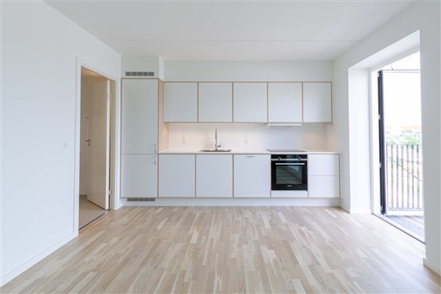 The building, known as Blåbærhaven, is an enclosed block comprising six floors and housing a total of 76 attractive apartments. The residences range from 46 to 119 square meters in size and include between two and five rooms. Thanks to Blåbærhaven's six levels and its location within Frederiksbro, residents can appreciate both a wonderful panoramic view of the surrounding area and a vibrant atmosphere close to Frederiksbro Square. Additionally, the building offers a cozy communal rooftop terrace available for all residents to use freely.