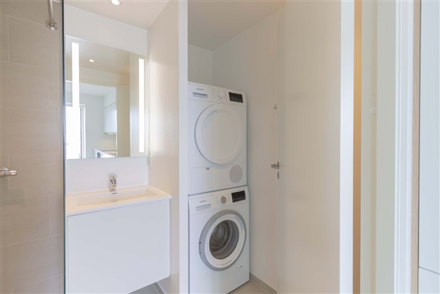 This charming two-room apartment features a bright open-plan living space where the living room merges seamlessly with a sleek Invita kitchen, creating a spacious kitchen-living area that opens directly onto a balcony. From here, you can enjoy your morning or afternoon coffee while taking in views of Hillerød's newest neighborhood, Frederiksbro.The bedroom is generously sized, offering built-in wardrobes as well as an additional storage room. The apartment includes Siemens appliances, such as a combined washer and dryer unit, and benefits from underfloor heating throughout all rooms.