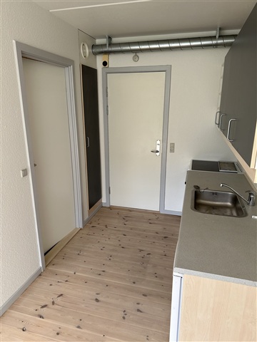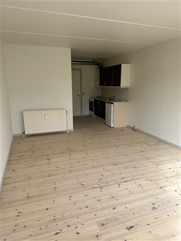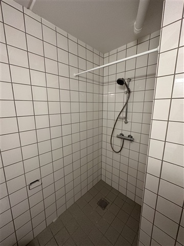 This bright studio apartment features a living area with its own bathroom, including a shower. Within the main room, there is a kitchen space equipped with a fridge-freezer, a sink, ample cupboard storage, and a stove fitted with an extractor hood. The living area also provides direct access to a small terrace.Residents benefit from on-site laundry facilities, complimentary parking exclusively for the building's occupants, and a private storage unit. The location offers convenient public transportation options to Aarhus city center.