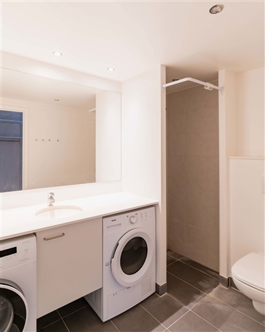 The bathroom is thoughtfully planned with modern fixtures, featuring a separate shower area and a laundry column, ensuring convenience and comfort in everyday routines.