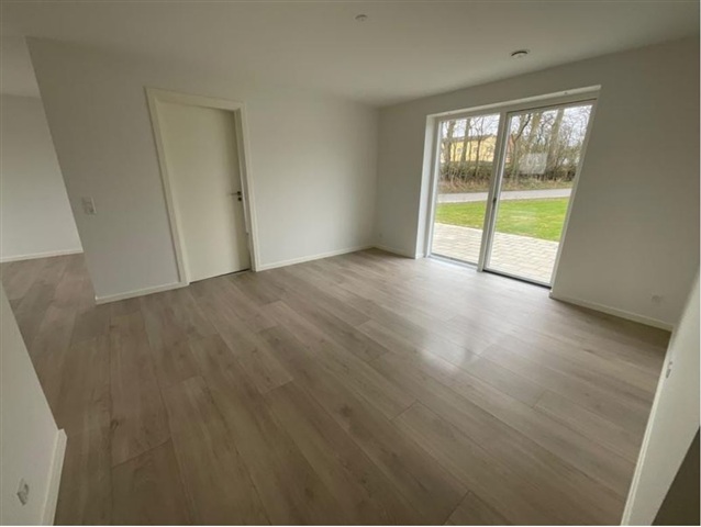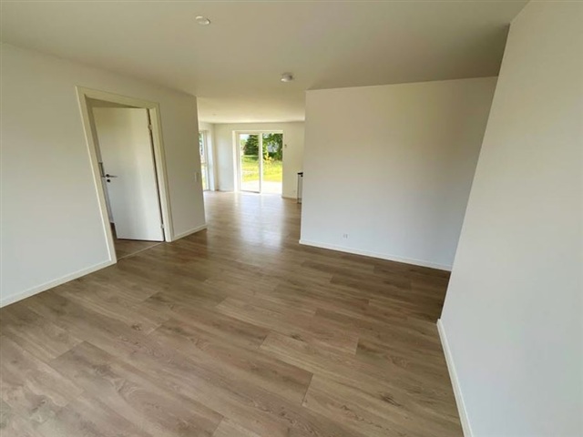 The terraced houses are distinguished by a large, open kitchen/dining space furnished with fixed cabinetry from HTH. Behind the cooking area, a glass splashback facilitates easy cleaning. This kitchen and dining area flow openly into the living room, which opens through terrace doors to the garden and patio. The children's rooms are of practical, regular shapes, while the main bedroom features built-in wardrobes.