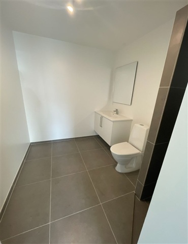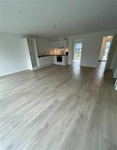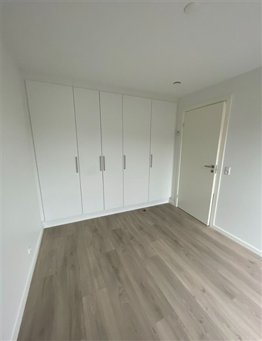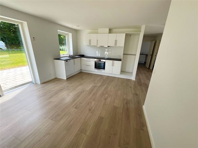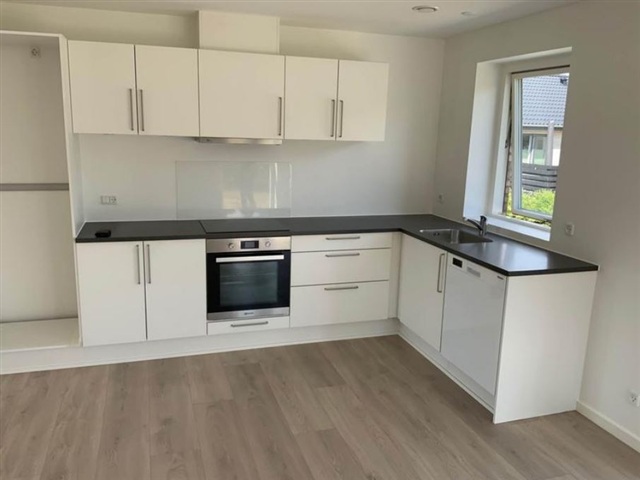 Floors in the kitchen, dining room, living room, and bedrooms are finished with oak laminate planks. The entrance, utility room, bathroom, and shower area boast elegant large-format, dark grey 60x60 tiles. Throughout the terraced houses, the walls and ceilings are smooth and white, complemented by white-painted woodwork. All doors have a sleek white finish with stainless steel handles and lack doorsteps to ensure easy operation. Window sills are constructed of masonry and finished with white render.