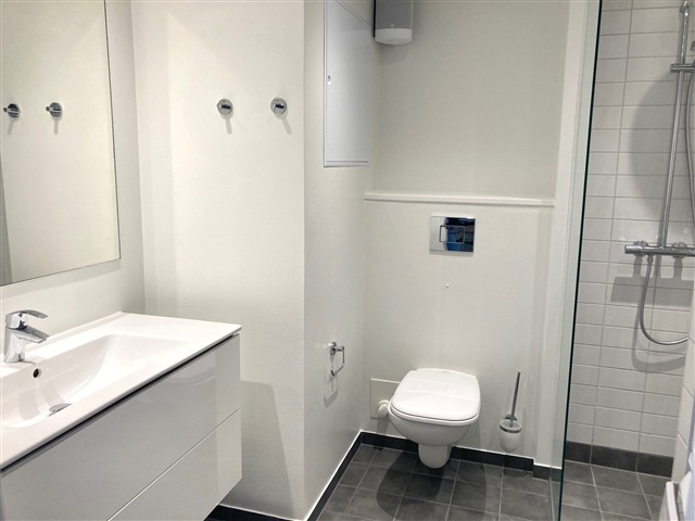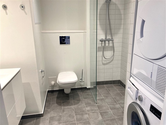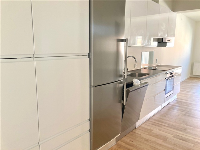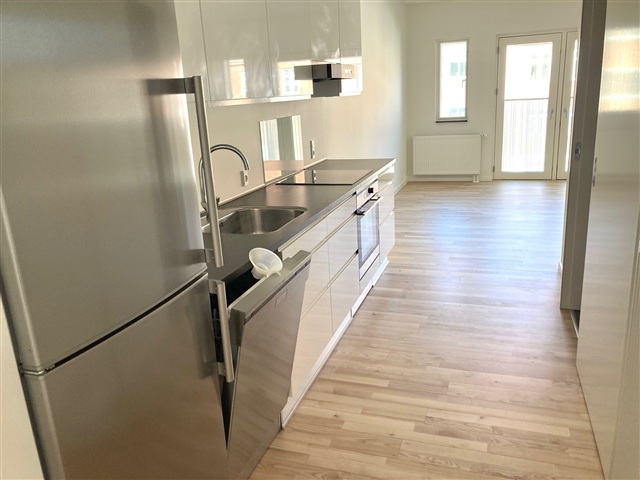 Located in Fillippas Have on Nyborgvej in Odense C, this two-room apartment spans 57 m² and is situated on the first floor of a building equipped with elevator access. Entry to the unit is from the courtyard, where residents can opt for either the elevator or the stairwell, which is also reachable from street level.The apartment's entrance opens from a spacious, wide balcony leading directly into the combined hallway and kitchen area. The bedroom is generously sized and features built-in wardrobes for ample storage. The kitchen is a stylish Designa installation with high-gloss finishes and aluminum edges, complemented by spotlights and a full range of appliances. Among these are a GRAM dishwasher, as well as a private washing machine and tumble dryer.