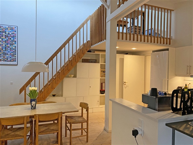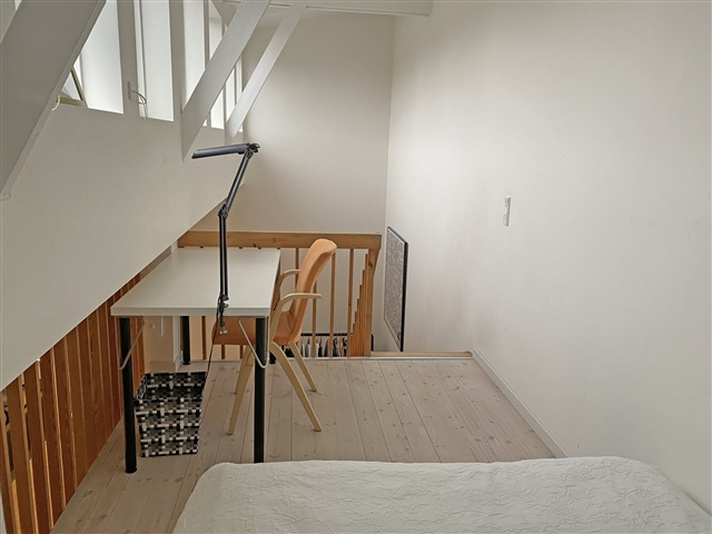 This furnished two-level apartment offers a welcoming and well-organized layout with a cozy, modern style. The lower floor features an open kitchen equipped with timeless white cabinetry, seamlessly connected to a spacious living room that accommodates both a dining area and a sitting space. In addition, there is a bedroom furnished with a double bed as well as a neatly kept bathroom.On the upper floor, there is a versatile bonus space that can be effectively utilized as a home office, guest room, or an additional bedroom.