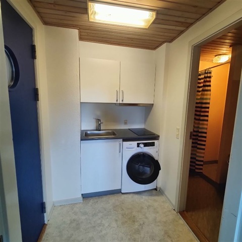 This recently renovated one-room apartment features a white Kvik kitchen equipped with a fridge-freezer, a ceramic cooktop, and a combined washer-dryer unit. The living area includes a built-in wardrobe, complemented by a spacious bathroom.- Parking