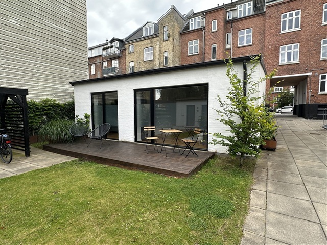 Situated in the heart of Aarhus C within the Øgadekvarteret, this distinctive two-room townhouse offers a peaceful courtyard setting. Constructed in 2018, the residence presents a contemporary and welcoming atmosphere, featuring a thoughtfully designed layout. The spacious and bright living area opens up seamlessly to the kitchen, creating an open-plan environment. The bedroom is generously sized and includes built-in wardrobes for practical storage.Both the living room and bedroom provide direct access to a private courtyard, allowing for tranquil outdoor living in a quiet and sheltered environment. The large bathroom is finished with a sleek design and is equipped with a rain shower as well as its own washing machine and dryer.