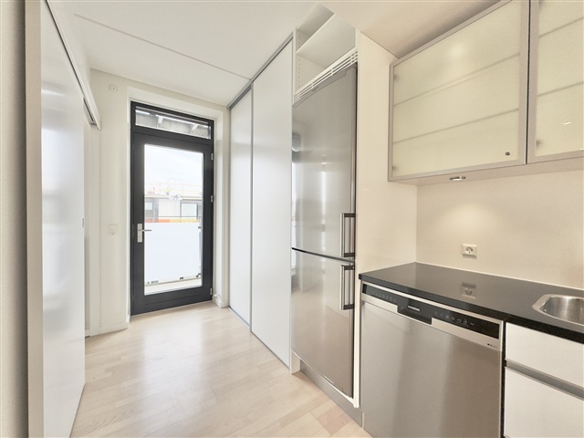 A stylish two-room apartment measuring 49 square meters is available for rent in Munkebjerg Park, located on the first floor. Upon entering, you are greeted by a spacious hallway featuring built-in wardrobes, which leads directly into an open kitchen equipped with high-gloss cabinetry, a granite countertop, and a full set of appliances, including a dishwasher.From the hallway, access is provided to a smaller bedroom that also includes fixed wardrobes. The apartment boasts a large, well-appointed bathroom with a shower enclosure, a wall-mounted toilet, built-in storage, a combination washer-dryer machine, and underfloor heating. The bright living room, accessible from the kitchen, offers ample space for both dining and lounging, and opens onto a balcony.