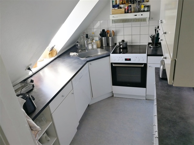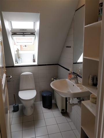 This bright and charming room features exposed beams, adding character to the space. It includes a built-in wardrobe and a loft area that provides ample storage or sleeping space. The kitchen, equipped with a dishwasher, stove, and fridge-freezer, is shared between this tenant and four others. Additionally, there is a spacious communal dining room suitable for group meals, along with two bathrooms that are shared among the residents.In the basement, tenants have access to a shared laundry facility and a bike storage area. The property also offers a cozy courtyard for communal use. Situated in the delightful Frederiksbjerg neighborhood, the apartment benefits from numerous quaint streets, cafés, and shopping options nearby. It is also conveniently close to green spaces such as ASA, Ingerslev Boulevard, and Havreballe Forest.