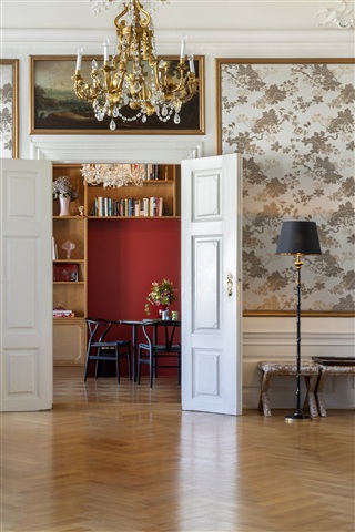 The apartment's large, barred windows with transom frames ensure a generous amount of light from both the street and the courtyard. At the same time, they provide effective insulation and a remarkable calm. The floor plan is stately and flowing with several living rooms en suite, making the home suitable for both representation and private use in spacious settings.