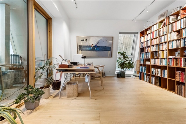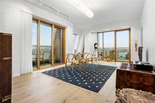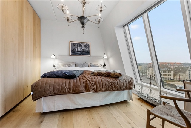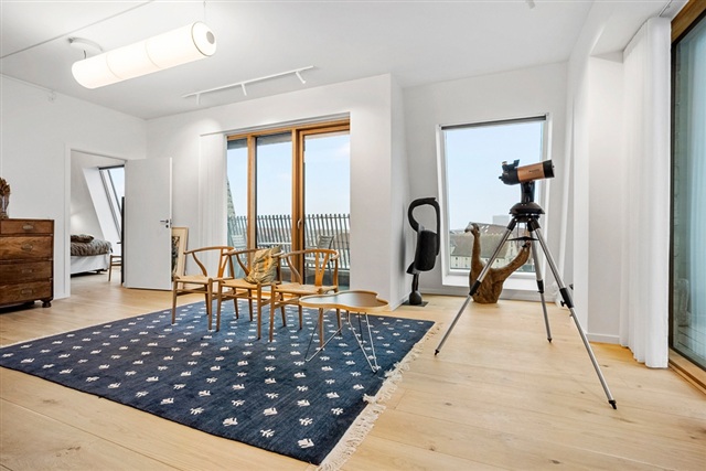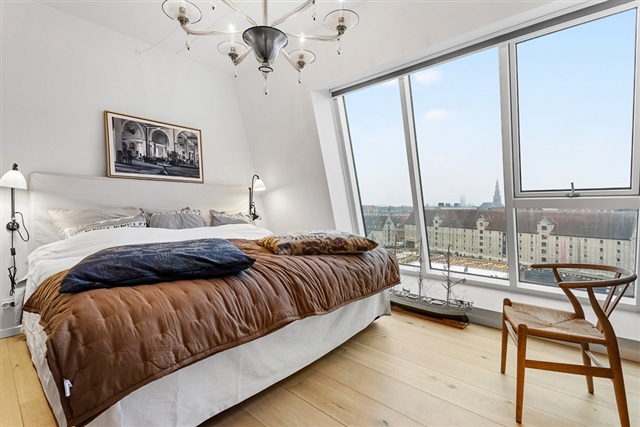 This exceptional penthouse apartment on Papirøen embodies unparalleled luxury and architectural sophistication in one of Copenhagen's most coveted locations. Situated on the sixth floor of a contemporary, well-maintained building equipped with an elevator, this exclusive corner unit boasts private parking within the property's underground garage. Residents are treated to breathtaking panoramic views encompassing the city's iconic skyline, the harbor stretches, Copenhagen Canal, and the charming neighborhood of Christianshavn. These vistas can be enjoyed from multiple balconies distributed across both the lower and upper levels of the apartment.Spanning a generous 215 square meters over two floors, the residence is characterized by an abundance of natural light and an open, airy atmosphere thanks to large window sections and several balconies on each level that seamlessly blend indoor and outdoor living spaces. Upon entering the lower floor, you are greeted by a spacious foyer with access to a dressing room and a stylish bathroom. This level also houses a beautiful master bedroom complete with built-in wardrobes and a welcoming living room featuring impressive views. An additional bedroom offers versatile options, suitable as a guest room or home office.