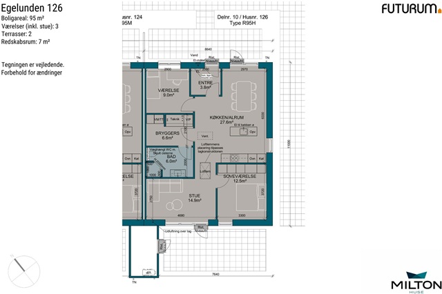 This bright and contemporary townhouse features a combined entrance and utility room, housing the home's technical installations along with a washing machine and dryer. Upon entering, you step into a spacious kitchen-dining area that seamlessly flows into the living room, from which access is provided to a modern bathroom, a large master bedroom, and an additional bedroom. The living room opens directly onto the private terrace located at the rear of the property.The residence includes a private garden and terrace, complemented by a 7 m² storage shed. Parking is available in shared communal areas. All utility expenses are settled directly with the respective service providers. The townhouses, available as both terraced and semi-detached units, are designed to be open and filled with natural light. Light enters generously through well-placed windows, enhancing the welcoming atmosphere created by the Troldtekt ceilings and smooth, white plastered walls. Oak plank laminate floors extend through the kitchen-dining area, living room, and bedrooms, while the entrance, utility room, bathroom, and shower feature stylish dark gray tiled floors. The doors are finished in smooth white with stainless steel handles and constructed without threshold steps, ensuring easy access throughout. Window sills are brick-built and rendered in white, with walls meeting the floor neatly finished by smooth, white baseboards.