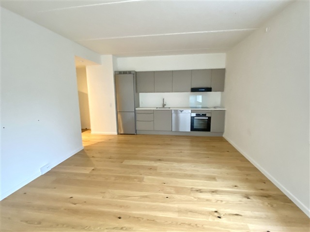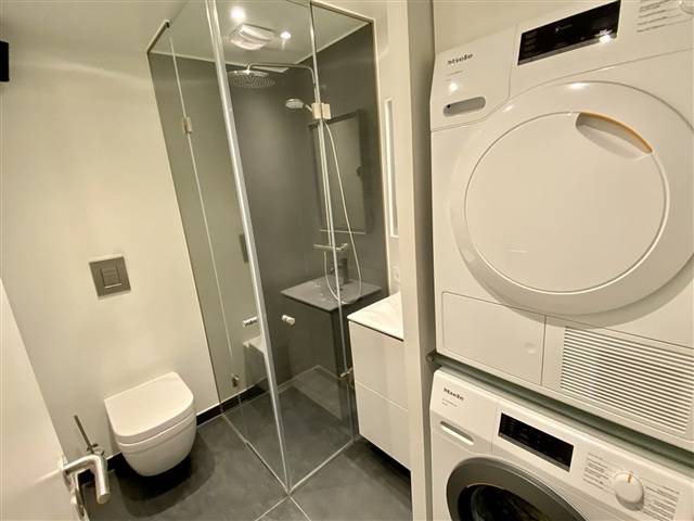A bright and charming two-room apartment measuring 63 m² is available for rent in the upper floors of the M Tower building, which is served by an elevator. Upon entering from the stairwell, you arrive in the hallway that provides access to a beautifully tiled bathroom featuring a shower area and a wall-mounted toilet by Grohe. The bathroom is equipped with a stylish illuminated mirror and a washbasin with cabinetry from Duravit. Underfloor heating adds comfort, and in one corner, there is a high-quality Sonos speaker. Additionally, the bathroom includes a Miele washing machine and tumble dryer.The kitchen, designed by Designa, boasts a matte gray finish with an elegant Corian countertop, and comes fully equipped with all appliances from Miele. It opens up seamlessly to a bright living room which leads to a spacious balcony. The bedroom offers built-in wardrobes for ample storage.