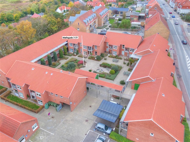 The residences located on Møllegade, Frederiksgade, Vestergade, and Havnevej are situated in the city center, within close proximity to the pedestrian streets and shopping options. Together, these developments comprise a total of 95 housing units, all of which are either newly constructed or renovated apartment buildings completed between 1986 and 1999. Each complex is equipped with shared laundry facilities. Specifically, apartments at Møllegade 18-52 feature balconies that can be opened. Every unit is connected to fiber broadband, allowing residents to contract with various providers for television, internet, and related services. Alternatively, the buildings have their own antenna systems through which YouSee offers internet and TV packages. Exterior window cleaning is carried out about four times a year for nearly all apartments, while stairwell cleaning takes place regularly. Additionally, the housing association owns three guest rooms and a communal hall located elsewhere in Skive city, both of which are available for rental by all tenants.
