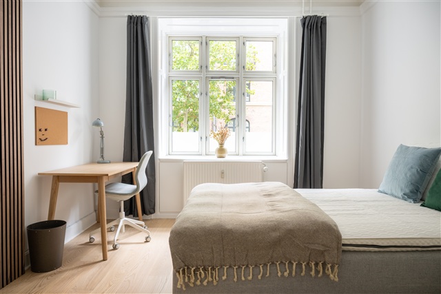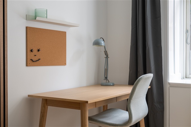 This charming, traditionally styled apartment has undergone a complete renovation. It includes five separate bedrooms, a spacious dining kitchen outfitted with all necessary appliances, a centrally located living room, and two contemporary bathrooms.Each bedroom features a premium bed complete with a bedspread, duvet, and pillows. Additional furnishings include a bedside table accompanied by a reading lamp, a desk paired with a chair and desk lamp, and a wardrobe offering both drawers and hanging space. Storage boxes are conveniently placed beneath the beds. The rooms are also equipped with curtains, a mirror, a laundry basket, a trash bin, rugs, and various decorative items, though not all are depicted in the photographs.