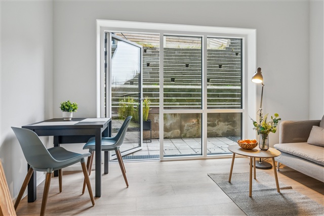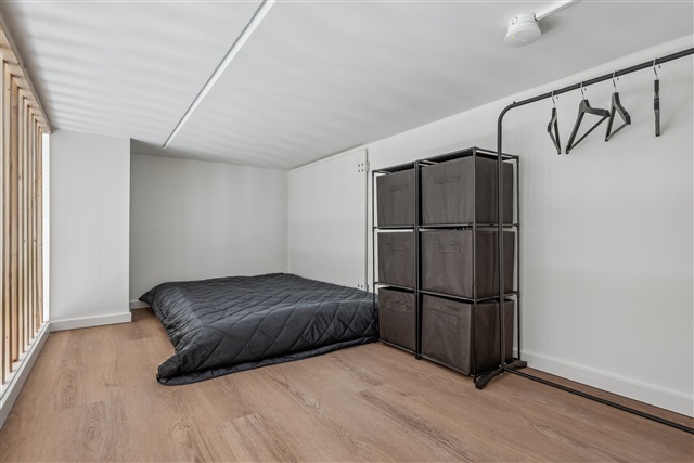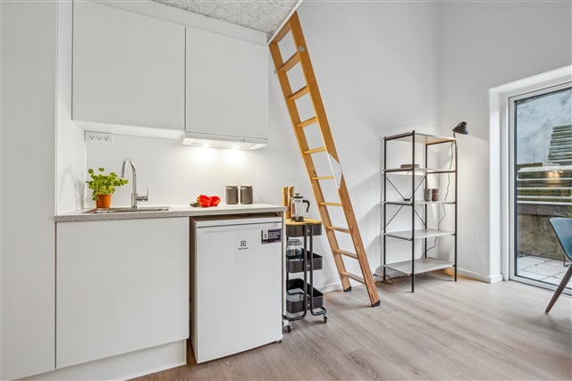 This studio apartment is situated on the ground floor and includes a private kitchenette equipped with a two-zone stovetop, a refrigerator with a freezer compartment, and an exhaust hood. The interior is characterized by high ceilings, a cozy loft area, and a private terrace. In addition, the unit features its own bathroom with a separate shower cubicle and toilet.The building offers several communal spaces both indoors and outdoors. Inside, there are three large shared rooms primarily designed for laundry use, with a few tables and chairs available for those waiting. Outside, residents have access to landscaped green areas and a basketball court, perfect for playing with neighbors. Parking spaces are available for rent, and for bicycles, there is access to a locked bike shed. The apartment benefits from a favorable location near Ceres Park and the natural surroundings of Marselisborg Palace. Aarhus city center is conveniently reachable within 5 kilometers, providing easy access to various urban amenities. Furthermore, several major educational institutions are within a manageable biking distance, including the Business Academy (6 minutes), Aarhus Business College (7 minutes), and Aarhus University (12 minutes).