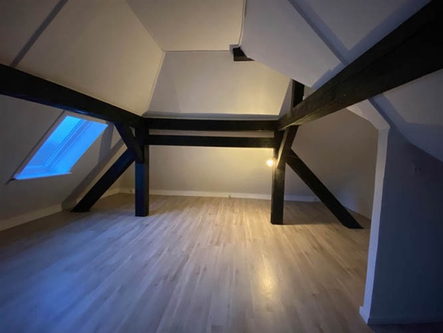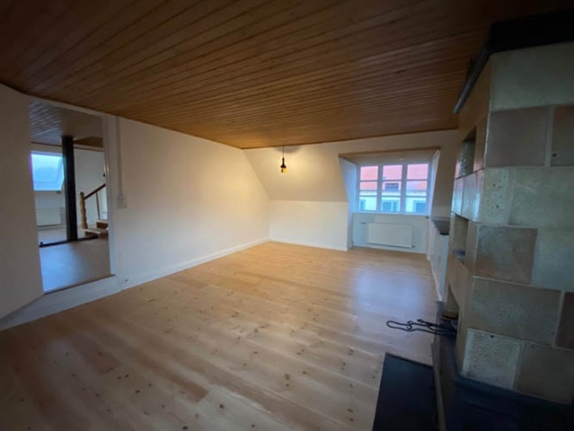 This rental property is ideal for a small family or a couple seeking generous space and openness.The apartment itself is a spacious 3-room unit measuring 112 square meters, featuring large, bright rooms with beautifully refinished wooden floors. Upon entering at ground level, you ascend to the main living area located on the first floor. The living room is notably large, complemented by a generously sized kitchen-dining area equipped with a classic traditional Christiansfeld wood-burning stove. Both the dishwasher and washing machine are brand new. The bathroom includes a shower enclosure and is fitted with completely new, elegant white cabinetry that offers ample storage. The bedroom is particularly spacious with attractive wooden flooring and charming black wooden beams. From the living room, there is access to a pleasant balcony that overlooks fields and part of the garden. The property benefits from well-maintained communal garden spaces. Parking is available free of charge immediately adjacent to the entrance of the apartment.