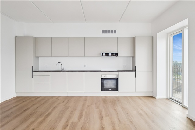 This bright and contemporary three-room apartment spans 92 square meters and is situated in the sought-after neighborhood of Stigsborg, an area known for its blend of community spirit, natural surroundings, and urban living. It offers an ideal residence for couples or small families looking for a move-in-ready home where quality and practicality are prioritized. The apartment also features a west-facing balcony, perfect for enjoying the evening sun.Inside, the property comprises two spacious bedrooms and a large, inviting living room, all equipped with underfloor heating and durable Moland hardwood floors. The kitchen is designed with a sleek Invita style, incorporating integrated appliances and modern materials. The bathroom includes a convenient laundry column with both a washing machine and a tumble dryer. Residents benefit from an elevator within the building and tastefully decorated communal areas.