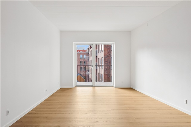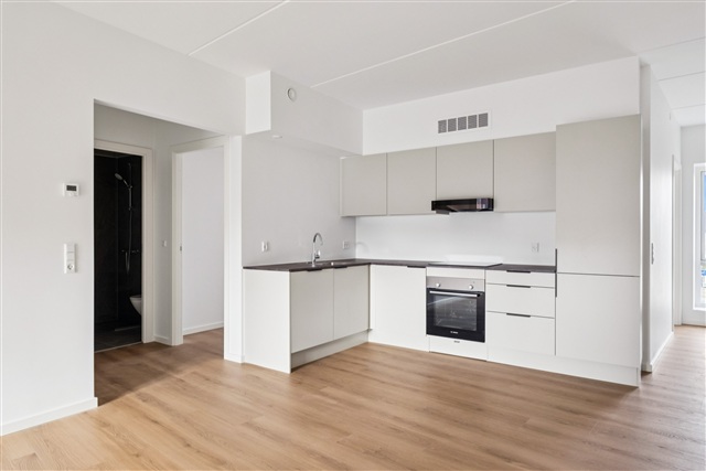 Situated in the vibrant district of Stigsborg, right in the center of Nørresundby's newest and highly sought-after neighborhood, this contemporary four-room apartment offers proximity to the fjord, lush green spaces, and the heart of Aalborg. This residence perfectly marries practicality, comfort, and an exceptional location.The apartment features a bright living area seamlessly connected to an open-plan Invita kitchen equipped with integrated appliances. There are three well-sized bedrooms and a sleek bathroom that includes a laundry column with both washing machine and dryer. Premium Moland wooden flooring runs throughout the entire 104 m², complemented by underfloor heating in every room, contributing to a warm and welcoming environment. From the living room, French doors lead directly onto a south-facing balcony, providing ample sunlight well into the evening hours.
