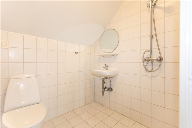 The bathroom is designed to be both bright and simple, featuring light-colored tiles covering the walls and floor. It includes a shower area, a sink with an integrated shelf and rounded mirror, as well as a toilet. The sloped ceiling is thoughtfully incorporated, optimizing the use of space while maintaining a neat and functional appearance.