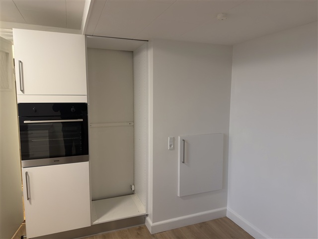 The kitchen features a bright and practical design, equipped with white cabinetry and dark countertops that provide ample workspace by the window. It includes an integrated oven and stovetop, along with plenty of storage cabinets and room for a small dining area. A designated niche is set up to accommodate a refrigerator and freezer, allowing for easy customization according to your preferences.The bathroom is both spacious and modern, containing a separate shower enclosure, a window that offers natural light and ventilation, and a contemporary vanity with drawers beneath and a large mirror - all designed to support the demands of a busy daily routine.