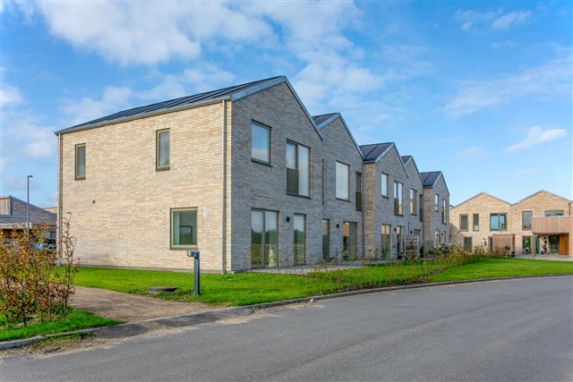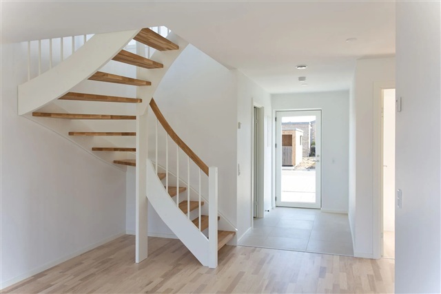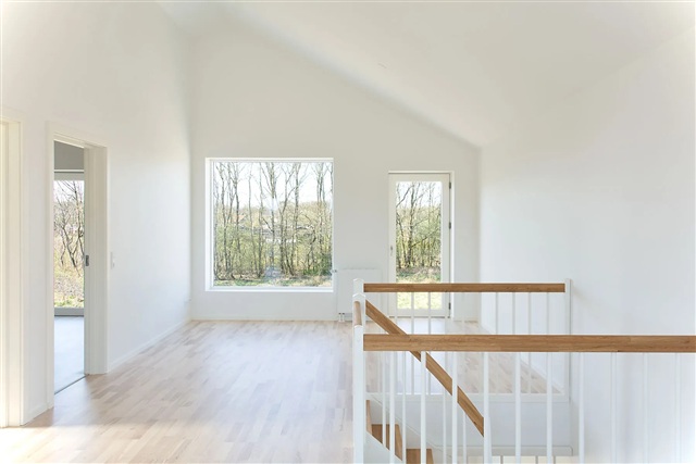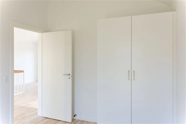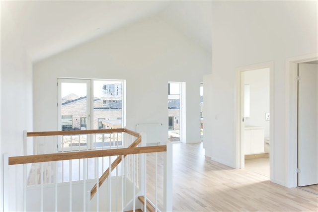 This modern and spacious townhouse, spanning 130 square meters, is situated in the scenic surroundings of Holing Engpark in Herning. The residence is thoughtfully laid out across two floors, providing a versatile design suitable for both families and couples.On the ground floor, you will find two bedrooms, a stylish bathroom, a functional utility room, and a multipurpose space that opens directly onto a terrace. From here, there are lovely views overlooking Fuglsang Sø. The upper level features a bright, open living area encompassing the kitchen, dining space, and living room, which extends onto a generous balcony also offering views of Fuglsang Sø. Additionally, this floor includes another bathroom and a bedroom.