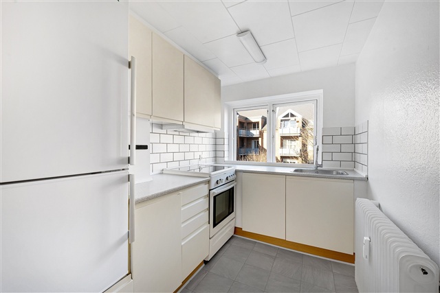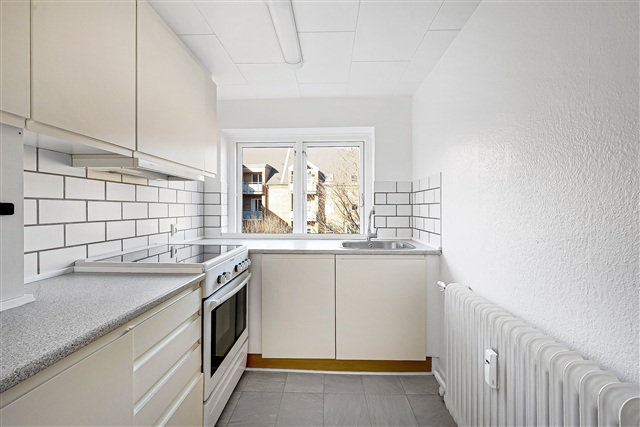This move-in ready apartment is situated in a classic city building and features a simple, timeless design. The layout has been carefully planned to maximize the use of space in a way that suits everyday living, while the light-colored surfaces ensure the rooms receive a pleasant amount of natural light throughout the day.Upon entering, you step into a hallway that offers space for outerwear and provides access to all the rooms. The kitchen is separate and bright, featuring a window that looks out onto the courtyard and neighboring buildings. It is equipped with white cabinetry, ample countertop space, and tiled walls that add a practical touch for busy routines. Included appliances are a dishwasher, stove/oven, and refrigerator.