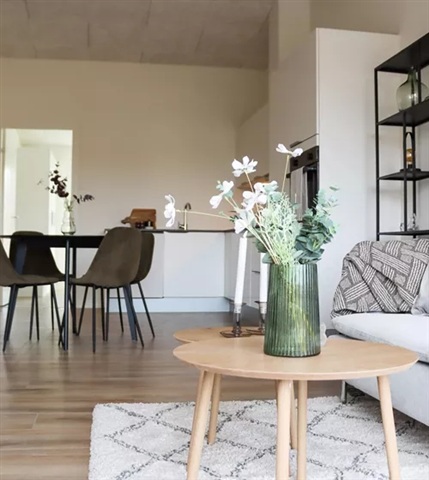 This charming three-room terraced house features a well-thought-out layout. Please note that all images, floor plans, and visualizations are for guidance only. The actual residence is a mirror image of the floor plan provided.The kitchen and living area are combined, with the kitchen arranged along a wall at an angle that accommodates both a dining space and a seating area. Bright surfaces and contemporary appliances contribute to a practical and welcoming kitchen environment. From the living room, there is direct access to the terrace, which invites outdoor living. The property includes a master bedroom and one additional room. The master bedroom is equipped with three built-in wardrobes and offers sufficient space for a double bed along with other furniture. The second room is versatile and can serve as a child's bedroom, an office, or a guest room, depending on the occupant's needs. Centrally located, the bathroom features a shower niche, toilet, and washbasin, with carefully chosen materials that harmonize with the overall design of the home. The entrance hall is designed for convenience, featuring storage cupboards. Both a washing machine and dryer are installed here, and there is room for a coat rack or shoe shelf.