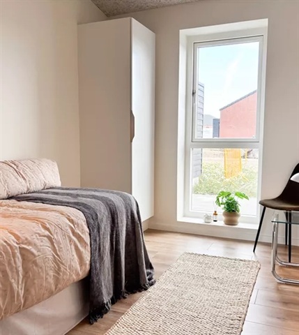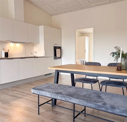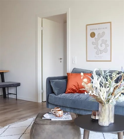 This spacious four-room terraced house offers well-proportioned bedrooms. Please note that all images, floor plans, and visualizations are for guidance only.The kitchen is positioned along one wall and seamlessly integrates into the open-plan living area, providing ample space for both a dining table and a comfortable seating arrangement. Bright materials combined with modern appliances give the kitchen a practical layout that is easy to furnish around. From the living room, there is direct access to a private terrace, which extends the living space outdoors.