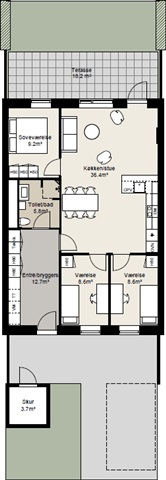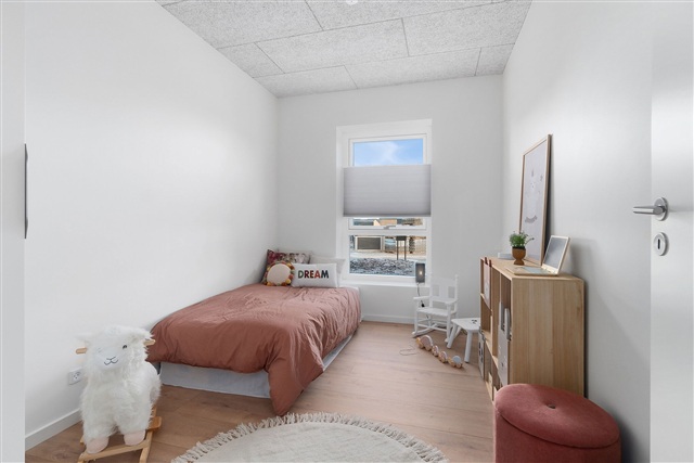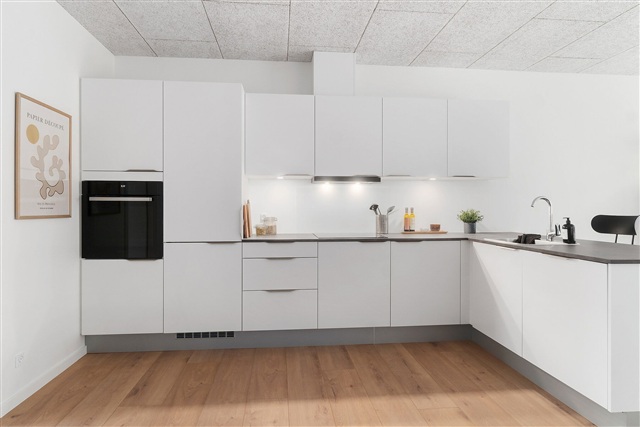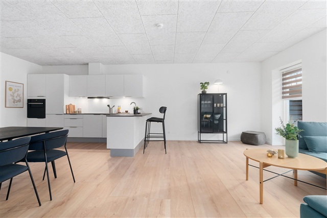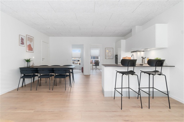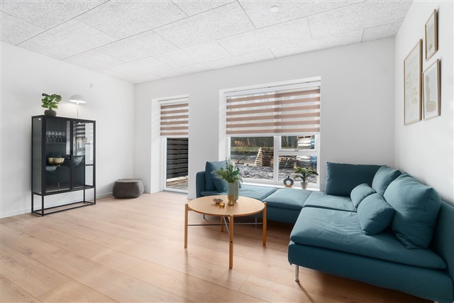 Situated in the desirable Silkeborg neighborhood on Katholtvej, this lovely residence offers a contemporary and thoughtfully designed living space amidst peaceful, green surroundings. The home seamlessly blends architectural style, practical functionality, and a strong sense of community, making it an excellent choice for families, couples, or anyone seeking a secure environment that balances privacy with social connection.Upon entering, you step into a bright and spacious hallway that serves as the central hub of the home, providing ample room for coats and shoes. Adjacent to this area is a practical utility room equipped with laundry facilities and additional storage, designed to simplify daily routines efficiently. The core of the house is the inviting open-plan kitchen and living area where cooking and relaxation come together in a well-lit, airy space. The kitchen features a sleek, modern design with generous countertop space and includes all essential appliances, such as a dishwasher. There is enough room here both for a long dining table and a cozy sofa setup, with natural light creating a warm ambiance throughout the day. From the dining space, direct access to a private terrace extends the living area outdoors, offering an ideal setting for enjoyment in both indoor and outdoor environments.