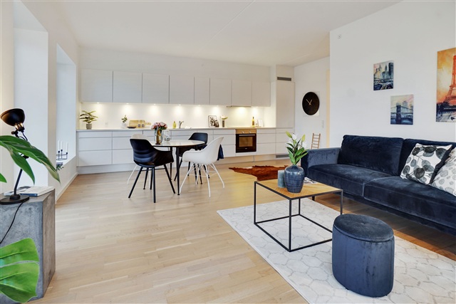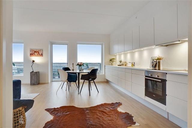 In the southern part of Ørestad stands a well-maintained apartment built in 2016, featuring a thoughtfully designed layout with plenty of natural light throughout the space. One of the highlights is the spacious, sun-drenched balcony that provides an inviting outdoor area perfect for relaxing. The central living area seamlessly combines the kitchen and living room into one open space, creating a warm and functional environment. The kitchen boasts a modern, timeless design with white, handleless cabinets, complemented by under-cabinet spotlights that offer excellent task lighting for cooking. Thanks to the generous dimensions of the living room, there is ample room to arrange both a comfortable seating area and a dining corner, making it ideal for hosting friends and family on weekends.Additionally, the apartment includes a utility room suitable for hiding away items such as the vacuum cleaner. The bathroom is equipped with a practical washer-dryer column for convenience. On pleasant days, the balcony becomes a desirable spot for enjoying the afternoon sun and can easily accommodate a small café table, a compact grill, and decorative plants if desired. Residents have access to a charming courtyard and a nearby canal, both serving as natural gathering points during the warmer months.