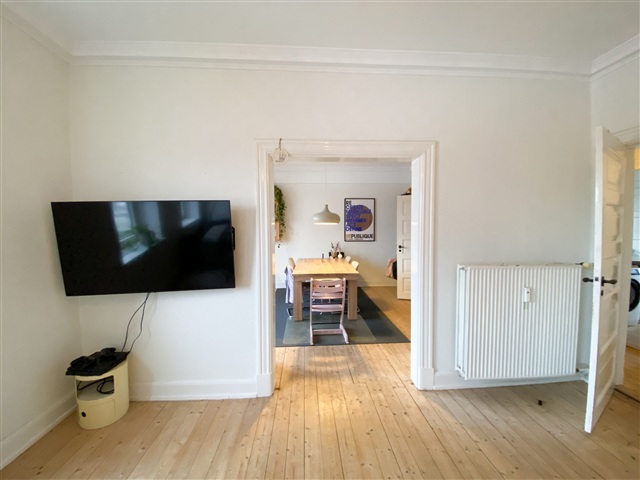 This charming, older apartment offers a wealth of classic character alongside an exceptional view overlooking Østre Anlæg. Featuring elegant stucco details, beautiful hardwood floors, and an abundance of natural light, the space exudes a warm and inviting ambiance throughout.Upon entering, you are greeted by a spacious hallway that seamlessly connects to the other rooms within the residence. The bathroom, while modest in size, is thoughtfully arranged with a centrally located bathing area, creating an open and comfortable environment for daily use.
