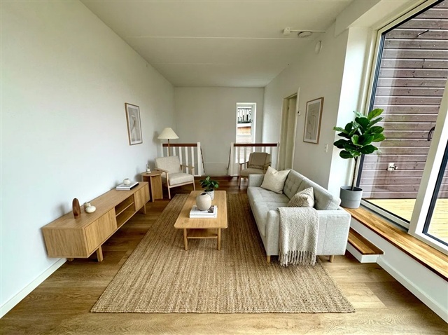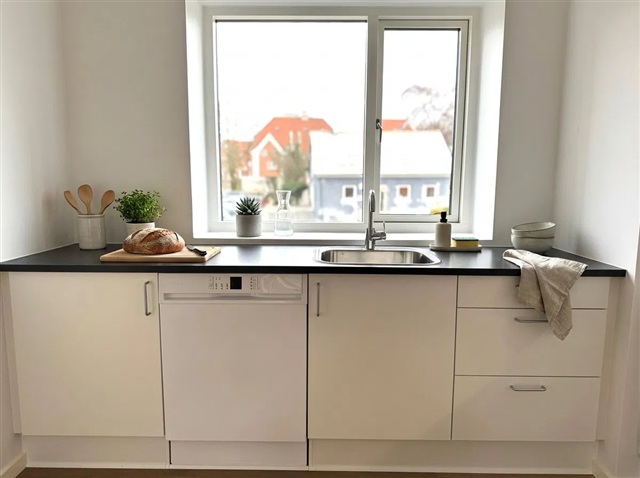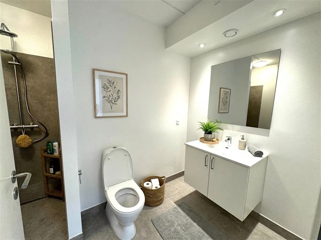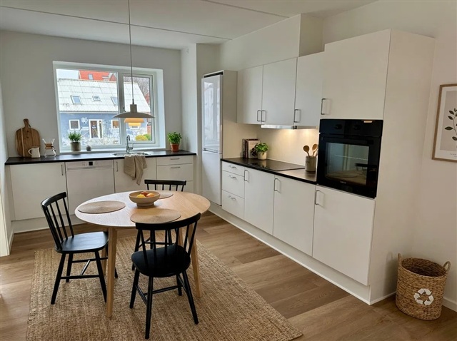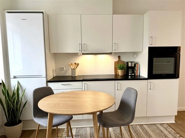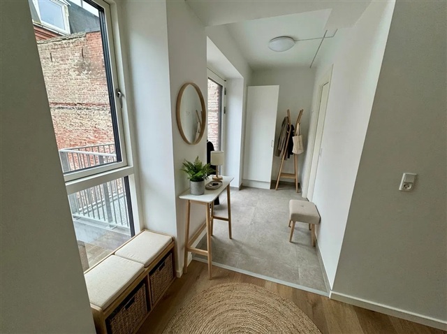 This apartment offers a harmonious blend of natural light and fresh air within a vibrant urban setting. Move-in ready, the residence provides a welcoming and comfortable environment.Upon entering at ground level, you are greeted by a bright hallway featuring tiled flooring that leads to a sleek bathroom equipped with a separate washing column. The open-concept kitchen and dining area form a warm and inviting space suitable for both cooking and relaxation. The kitchen boasts white cabinetry paired with dark countertops, presenting a contemporary look, and accommodates both a dining table and a cozy seating nook. Additionally, a room on this floor can be adapted for use as a guest bedroom or home office.