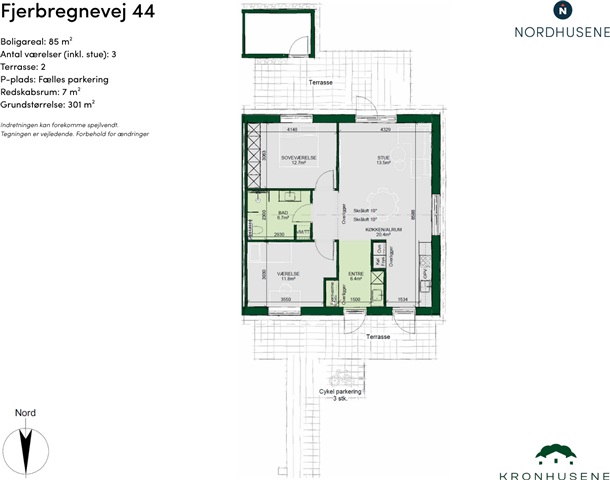 Outdoor amenities are thoughtfully planned with two terraces accessible from the living room, positioned east and west respectively, allowing for sunshine throughout the day. The property also features a 7 m² tool shed, a private parking space, and conveniently located bicycle parking adjacent to the front door. This modern, welcoming home combines natural light, simplicity, and smart practical solutions to create a comfortable living environment where one can feel at home immediately.
