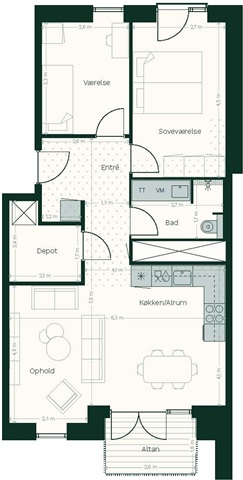 The residence is situated within one of the two apartment buildings, each ranging from three to five floors, and is strategically oriented east to west to ensure plenty of natural light throughout the day. Those units located at the gable end facing south benefit further from sunlight streaming through the south-facing windows or balcony. The central area of the home consists of a spacious kitchen-dining room combined with a living area, featuring oak flooring, neutral tones, and high-quality materials consistent throughout the entire apartment, creating a bright and welcoming atmosphere. Residents have direct access to a private balcony or terrace, where the flooring is finished with warm, reddish-brown Cumaru wood, known for its durability. For those occupying ground-floor apartments, a private garden space is also included, accessible via the balcony or terrace, which is surfaced with concrete pavers.