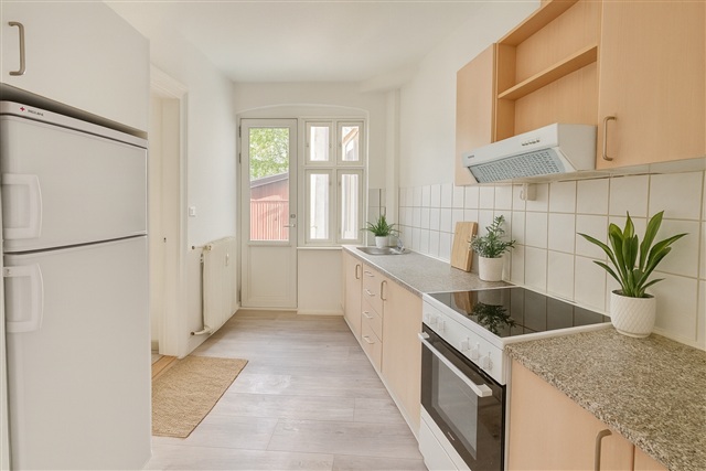 This spacious and bright ground-floor apartment with three rooms is conveniently situated in the heart of Rødkærsbro and features a practical layout with ample living space.Inside, the residence includes two adjoining living rooms, a kitchen equipped with a fridge-freezer, stove, and extractor hood, a hallway with a shower, a separate toilet, and a generously sized bedroom.