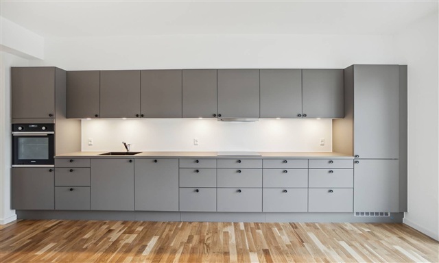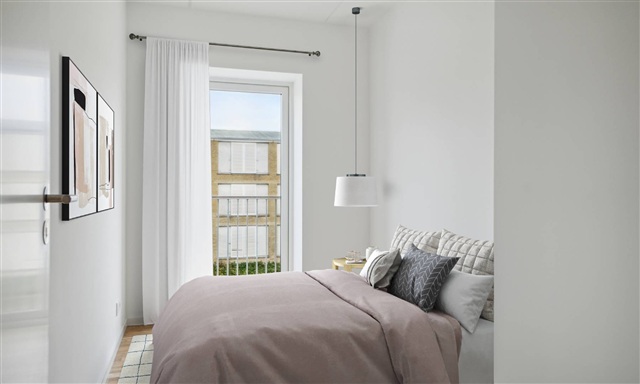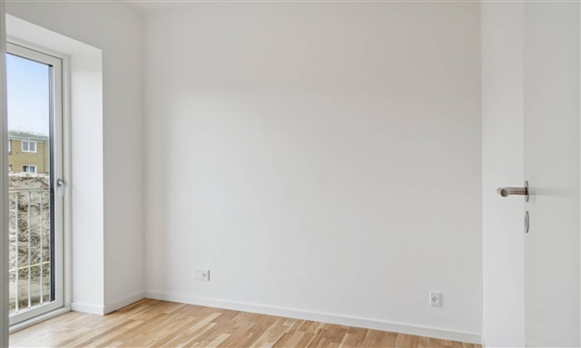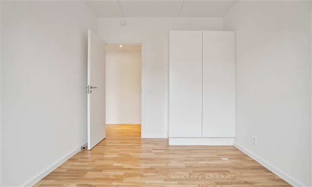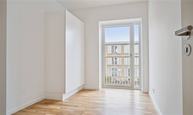 The family-oriented rental homes in Fløjhusene consist of single-floor apartments featuring between three and four rooms, all constructed with high-quality materials throughout. These residences vary in size from 75 to 89 square meters, and each unit comes with its own balcony or terrace. Within these spaces, you can relax with your feet resting on durable reddish-brown wooden floors that withstand wear well, while enjoying views overlooking the green courtyard.Inside, the apartments showcase attractive oak flooring combined with walls painted in a soft off-white, which reflect sunlight beautifully and create a bright, airy atmosphere throughout the entire living area. Built-in wardrobes equipped with shelves and clothing rods provide convenient storage options, allowing you to organize your belongings efficiently. When laundry day comes, you can make use of your own washing machine and dryer located in the spacious bathroom to handle your clothes.