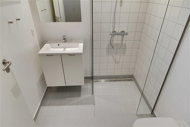 At Katrinedalsvej 51-69, one-bedroom apartments are available for rent, each featuring a private kitchen along with a spacious bathroom that includes a separate shower area and a vanity unit. Every tenant benefits from an individual storage room located in the basement, providing ample space for items such as ski equipment and holiday decorations.The rent includes an advance payment covering water, heating, and electricity expenses. The kitchens come equipped with a two-zone stovetop, a refrigerator with a freezer compartment, and an extractor fan. Furthermore, all residents have access to a communal laundry facility in the basement, which is furnished with both a washing machine and a tumble dryer.