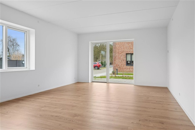 Situated just outside Vejle, this newly constructed building near Nørreskoven houses a three-room apartment equipped with contemporary amenities. The unit features underfloor heating, a dishwasher, as well as a washer and dryer for added convenience. The spacious kitchen and living area combines a dining space with a comfortable lounge corner, providing a perfect retreat after a busy day.Inside, the apartment includes a sizable entrance hall with wardrobe storage, a bedroom with a built-in closet, and an additional room that can serve as an office, guest room, or children's bedroom. The living room opens directly onto a delightful balcony, offering a pleasant outdoor space. The bathroom is outfitted in a modern style and includes a shower enclosure.