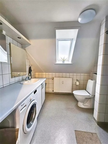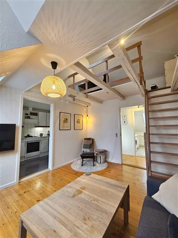This top-floor apartment exudes both brightness and character, positioned in a highly central location. It is move-in ready and offers a comfortable and inviting atmosphere throughout.Situated on the building's uppermost level, this charming penthouse benefits from ample natural light and tasteful architectural features. The layout is practical for daily living, enhanced by slanted walls, dormer and skylight windows, and exposed beams that contribute to a warm and welcoming environment. The entrance hall acts as a central hub, linking all rooms within the home. The living room is bright and versatile in design, with white-painted beams on the ceiling providing a cozy ambiance. From here, a staircase leads to a usable loft area, perfect for a home office or additional storage space.