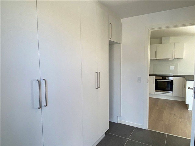 High-quality details are evident throughout the kitchen, bathroom, utility room, and master bedroom, all furnished with modern HTH cabinetry in a smooth white finish accented by stainless steel handles. The countertops boast a durable laminate surface in rustic slate tone, along with a spacious stainless steel sink. Behind the cooking area, a splash guard facilitates straightforward cleaning. The bathroom features a molded sink, a floor-mounted Ifö Sign toilet, premium German Hans Grohe fixtures, and a linear drain in the shower enclosure. Included with the property are well-regarded brand appliances such as a hob, pyrolytic oven, and a refrigerator/freezer combination. Provision has been made for a washing machine and dryer in the utility room, although these appliances are tenant-supplied.