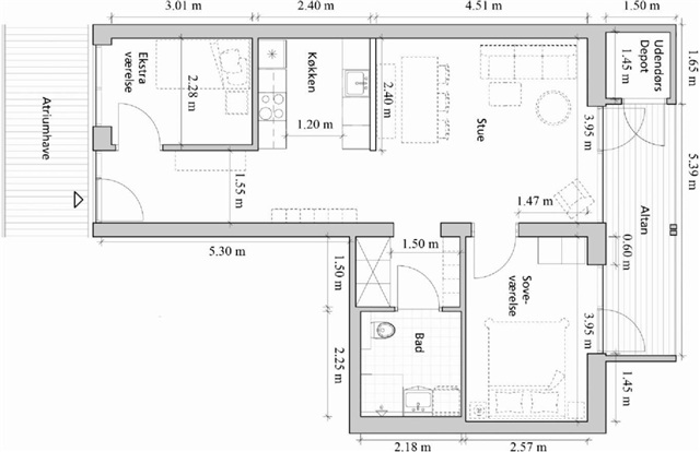 This three-room apartment offers a bedroom, a guest room or office, a bathroom, and a contemporary kitchen seamlessly connected to the living room. The bathroom is designed with space allocated for a washer-dryer column, should you choose to install one, and the kitchen is equipped with a dishwasher.Within this apartment, the bedroom provides a pleasant view overlooking the attractive atrium garden. From the living room, you have direct access to a private balcony that extends three meters in depth. In addition to this inviting outdoor area, there is a larger front space that leads onto the green communal grounds of the atrium garden, which can be personalized with items such as pots and a small bench to create a cozy setting.