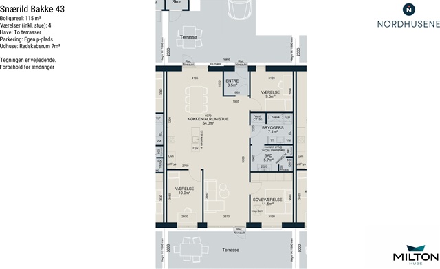 Upon entering the house, one is led directly into the spacious open-plan kitchen and living area combined. This room benefits from an abundance of daylight thanks to its large floor-to-ceiling windows, and it also offers access to two separate terraces positioned on either side of the residence. The kitchen, situated centrally within the space, allows for interaction with family members while cooking. The area provides ample room for arranging a cozy living corner as well as a dining nook. From the kitchen-living area, there is further access to two bedrooms, a large master bedroom featuring a built-in wardrobe wall, a utility room, and a bathroom.The property includes a private garden along with a terrace. Additionally, there is a 7-square-meter outbuilding used as a storage shed. Parking facilities consist of one designated parking spot located near the house. All utility expenses are billed directly to the tenant by the respective suppliers.