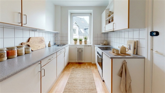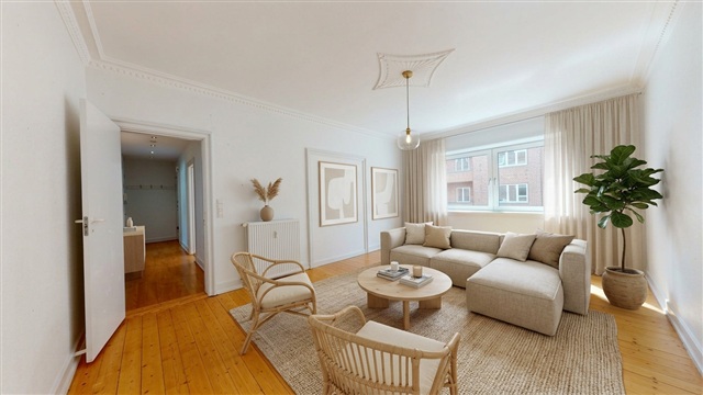 If you are a couple of friends or partners searching for a charming shared apartment in the lovely city of Aalborg, this property could be an excellent option for your new residence. Just a few minutes on foot from this address, you will find shopping facilities, pedestrian streets, restaurants, transportation options, and much more.Upon entering your new home, you are greeted by an entryway that offers ample space to hang coats and store shoes. This entrance opens up to a spacious hallway, which serves as a central point providing access to the rest of the apartment. The flat features a bright kitchen equipped with a large fridge-freezer and plenty of cabinet storage. The bathroom includes storage beneath the sink, built-in lighting above the mirror, and a generously sized separate shower cabin. There are three bedrooms, all bright and airy, with one of them having direct access to a pleasant balcony overlooking the cozy courtyard area.