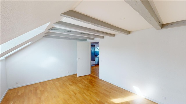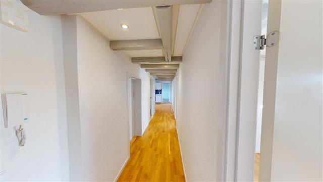 One of the apartment's most striking features is the beautiful exposed beams that adorn the ceiling throughout the space, adding a unique charm and a sense of authenticity that sets it apart.