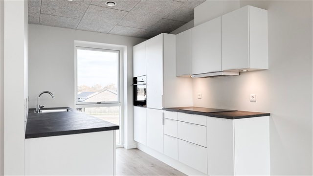 In the sought-after Billund area, you will find a collection of 44 bright and contemporary rental homes featuring between 2 and 5 rooms. These residences are designed with an emphasis on functionality, ample natural light, and high-quality materials. The dwellings are arranged over two levels separated by a horizontal division, where one unit occupies the ground floor and another is situated on the first floor. Each home offers either a private terrace with a garden for those on the ground level or a spacious rooftop terrace for the first-floor apartments.This terraced house includes several key features: it is a modern residence classified with energy rating A2015, thoughtfully laid out to maximize space with practical storage options. Underfloor heating is installed throughout all rooms, each equipped with individual thermostats. A ventilation system is in place to guarantee a healthy and comfortable indoor climate. The kitchen is from Tvis, boasting a sleek, handle-free design and comes complete with all built-in appliances. Floors with an oak-look finish provide warmth and character to the interiors. Every home has a private outdoor space in the form of either a terrace or a balcony, and parking is provided just outside each door. Residents also have access to a shared green park area, complete with a playground, walking paths, and inviting seating spots.