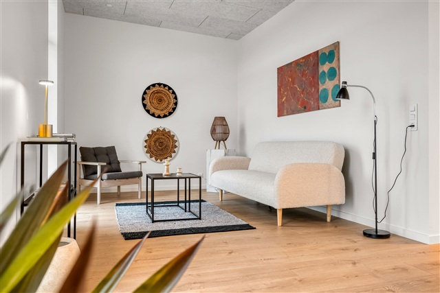Situated in the sought-after Billund area, this development comprises 44 bright and contemporary rental homes, offering between two and five rooms. The residences are designed with an emphasis on practicality, abundant natural light, and the use of high-quality materials. Arranged across two levels with a horizontal dividing line, each pair of homes consists of one unit on the ground floor and another on the first floor. Ground-floor apartments include a private terrace accompanied by a garden, while those on the upper floor feature spacious rooftop terraces.This townhouse includes several notable features: it is classified under energy rating A2015 and boasts thoughtfully planned layouts along with ample storage solutions. Every room is equipped with underfloor heating controlled by individual thermostats. A ventilation system is installed to maintain a healthy and comfortable indoor environment. The kitchen is a sleek, handle-free design from Tvis, complemented by a full set of built-in appliances. Flooring in an oak-wood appearance adds warmth and character to the living spaces. Each unit benefits from either a private terrace or a balcony, plus a dedicated parking space conveniently located near the entrance. Residents also enjoy access to communal green park areas, which include playgrounds, walking paths, and pleasant seating zones.