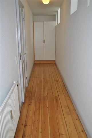 A separate bathroom is equipped with both a toilet and a washing machine. Furthermore, the hallway features some small storage solutions. Positioned in a central location, the apartment is within close walking distance to the pedestrian street, shopping, and other city amenities, making it an ideal home for those seeking a dwelling that combines character with a desirable address.
